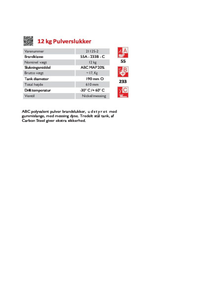 Denne 12 kg pulverslukker er udviklet til at håndtere en bred vifte af brande i både faste stoffer, væsker og gasarter. Med en totalvægt på 17 kg kombinerer den robusthed med stor slukningseffekt, hvilket gør den ideel i miljøer med høje sikkerhedskrav. Pulverslukkeren er klassificeret til brandklasse 55A, 233B og C, hvilket betyder, at den kan håndtere træ, papir og tekstiler (A). Brændbare væsker som benzin og olie (B) samt gasbrande (C).